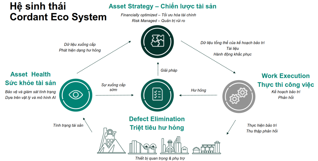 - Asset Strategy (Chiến lược tài sản): Đóng vai trò Financially optimized (Tối ưu hóa tài chính) và Risk Managed (Quản trị rủi ro). Nhận dữ liệu xuống cấp, phát hiện hư hỏng từ mô đun Asset Health (Sức khỏe tài sản)